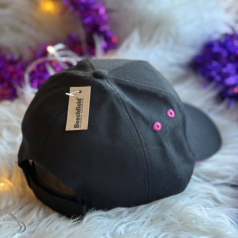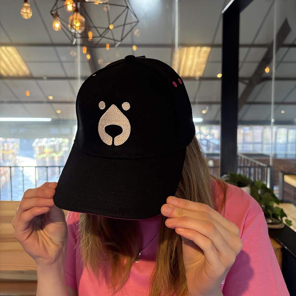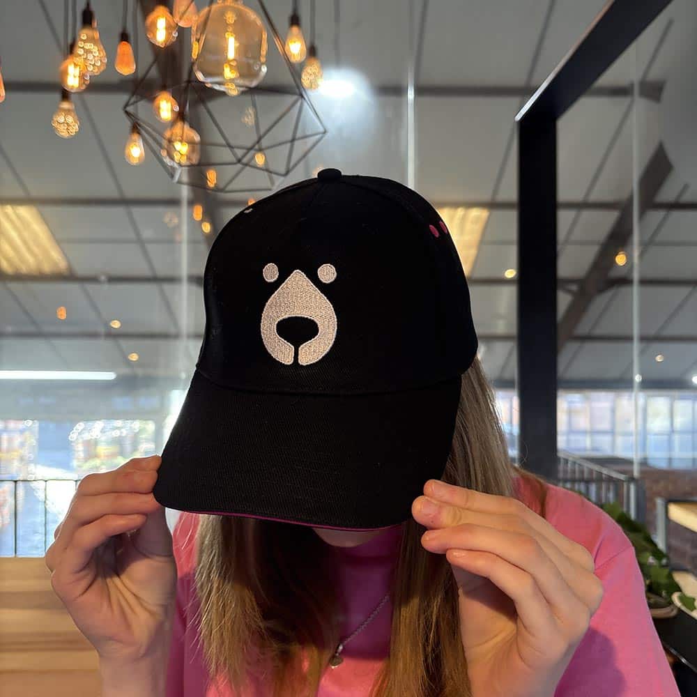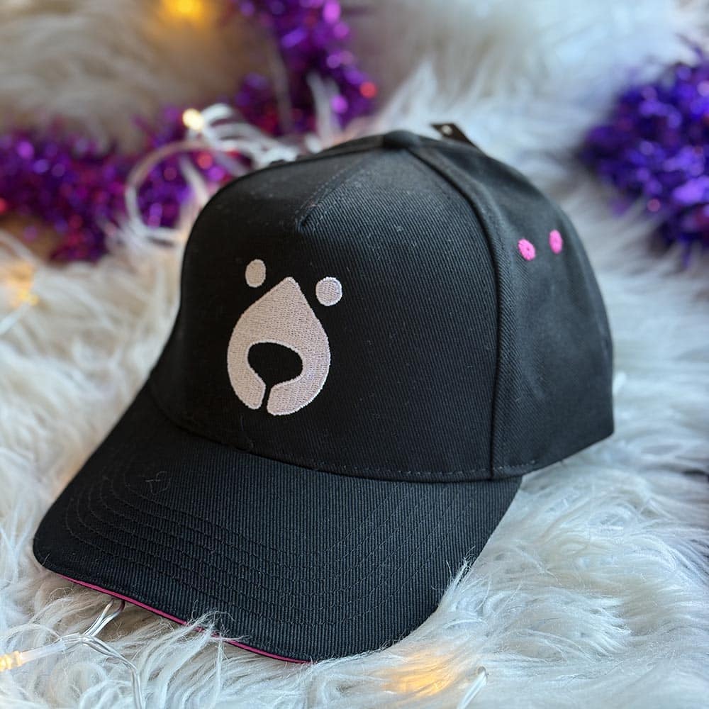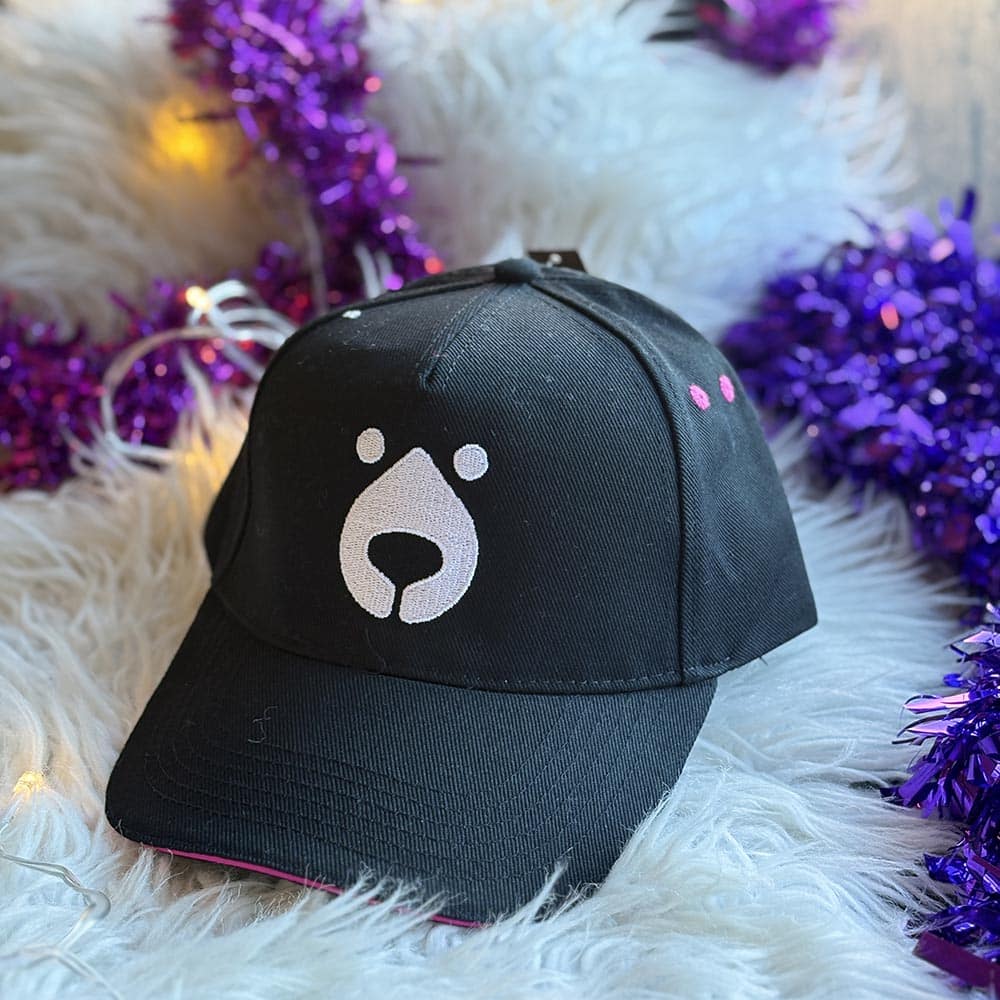 Stylish black cap, with pink bits and a bear on it – you’ll be the envy of all your cap wearing friends.